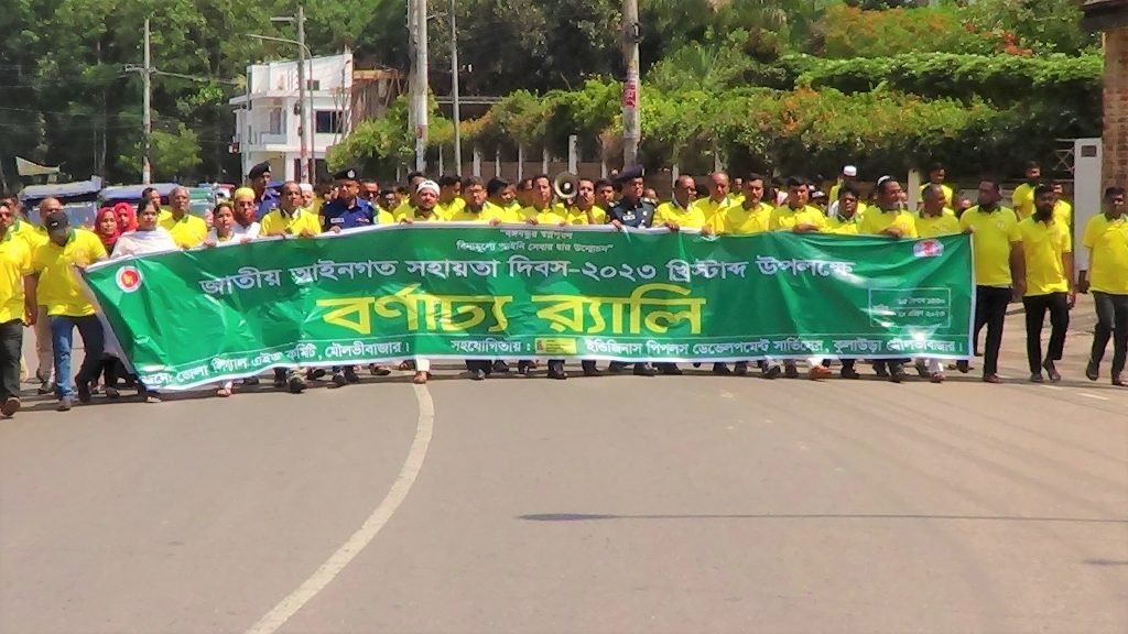 মনজু বিজয় চৌধুরী॥ জাতীয় আইনগত সহায়তা দিবস ২০২৩ উপলক্ষে মৌলভীবাজারে জেলা লিগ্যাল এইড কমিটি আয়োজনে ২৮ এপ্রিল শুক্রবার সকাল সাড়ে ৯টায় জেলা ও দায়রাজজ কোর্টের সামনা থেকে জেলা লিগ্যাল এইড কমিটির চেয়ারম্যান এবং বিজ্ঞ জেলা ও দায়রাজজ আল মাহমুদ ফায়জুল করিমের নেতৃত্বে বর্ণাঢ্য র্যালী বের হয়। র্যালীটি প্রেসক্লাব মোড় নিয়ে জেলা শিল্পকলা একাডেমিতে গিয়ে সমাপ্ত হয়।