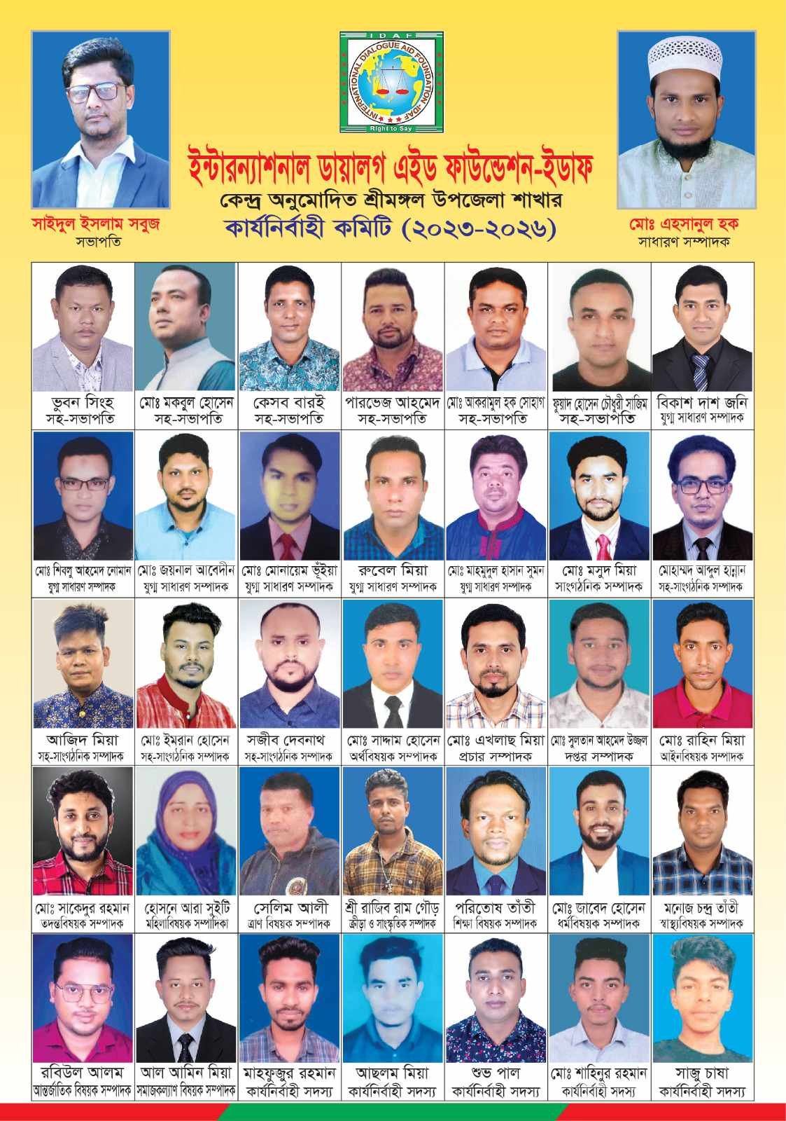 মনজু বিজয় চৌধুরী॥ শ্রীমঙ্গলে ইডাফ মানবাধিকার সংস্থার নতুন কমিটি, সভাপতি সবুজ সম্পাদক এহসান জাতীয় মানবাধিকার সংস্থা ইন্টারন্যাশনাল ডায়ালগ এইড ফাউন্ডেশন-ইডাফ (গভ. রেজি. এস-৭৫১৫) এর শ্রীমঙ্গল উপজেলা শাখার নতুন কমিটির অনুমোদন প্রদান করেছে সংগঠনের কেন্দ্রীয় কমিটি। গত ১৯ আগস্ট দুপুরে ইন্টারন্যাশনাল ডায়ালগ এইড ফাউন্ডেশন (ইডাফ) এর চেয়ারম্যান নাসরিন আক্তার ও ভাইস চেয়ারম্যান আল মুরাদ স্বাক্ষরিত কেন্দ্রীয় সংগঠনের প্যাডে প্রেরিত এক চিঠিতে শ্রীমঙ্গল উপজেলা শাখার কার্যনির্বাহী কমিটি (২০২৩-২০২৬) এর অনুমোদন প্রদান করা হয়। মানবাধিকার ও সমাজকর্মী সাইদুল ইসলাম সবুজ-কে পুনরায় সভাপতি এবং সাংবাদিক-কলামিস্ট ও শিক্ষক মোঃ এহসানুল হক (এহসান বিন মুজাহির)-কে সাধারণ সম্পাদক করে ৩৭ সদস্যবিশিষ্ট কমিটির অনুমোদন দিয়েছে কেন্দ্রীয় সংগঠন। কমিটির অন্যান্যরা হলেন-সহ সভাপতি ভুবন সিংহ, মোঃ মকবুল হোসেন, কেসব বারই, পারভেজ আহমেদ, মোঃ আকরামুল হক সোহাগ, ফুয়াদ হোসেন চৌধুরী সাজিম, যুগ্ন সাধারণ সম্পাদক বিকাশ দাশ জনি, মোঃ শিবলু আহমেদ নোমান, মোঃ জয়নাল আবেদীন, মোঃ মোনায়েম ভূঁইয়া, রুবেল মিয়া , মোঃ মাহমুদুল হাসান সুমন, সাংগঠনিক সম্পাদক মোঃ মসুদ মিয়া, সহ-সাংগঠনিক সম্পাদক মোহাম্মদ আব্দুল হান্নান, আজিদ মিয়া, মোঃ ইমরান হোসেন, সজীব দেবনাথ, অর্থবিষয়ক স¤পাদক মোঃ সাদ্দাম হোসেন, প্রচার সম্পাদক মোঃ এখলাছ মিয়া, দপ্তর সম্পাদক মোঃ সুলতান আহমেদ উজ্জল, আইন বিষয়ক সম্পাদক মোঃ রাহিন মিয়া, তদন্ত বিষয়ক স¤পাদক মোঃ সাকেদুর রহমান, মহিলা বিষয়ক সম্পাদিকা হোসনে আরা সুইটি, ত্রাণ বিষয়ক স¤পাদক সেলিম আলী, ক্রীড়া ও সাংস্কৃতিক সম্পাদক শ্রী রাজিব রাম গৌড়, শিক্ষা বিষয়ক সম্পাদক পরিতোষ তাঁতী ,ধর্ম বিষয়ক সম্পাদক মোঃ জাবেদ হোসেন, স্বাস্থ্য বিষয়ক সম্পাদক মনোজ চন্দ্র তাঁতী, আন্তর্জাতিক বিষয়ক স¤পাদক রবিউল আলম, সমাজকল্যাণ বিষয়ক স¤পাদক আল আমিন মিয়া। এছাড়া কার্যনির্বাহী কমিটির সদস্যরা হলেন মাহফুজুর রহমান, আছলম মিয়া, কার্যনির্বাহী সদস্য শুভ পাল, মোঃ শাহিনুর রহমান এবং সাজু চাষা।