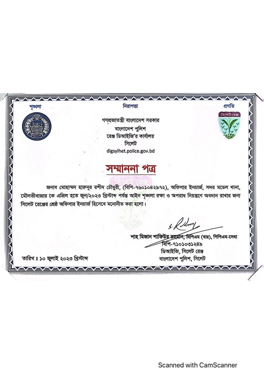 এছাড়া মোহাম্মদ হারুনূর রশীদ চৌধুরী, অফিসার ইনচার্জ, মৌলভীবাজার সদর মডেল থানায় যোগদান করার পর বিগত দুইবার জেলার শ্রেষ্ঠ অফিসার ইনচার্জ হিসেবে মনোনীত হয়েছেন।