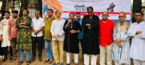 শুক্রবার বিকাল চারটায় ক্বীন ব্রিজ সংলগ্ন শারদা স্মৃতি ভবন (শারদা হল) প্রাঙ্গণে অনুষ্ঠিত প্রতিবাদী সাংস্কৃতিক আন্দোলনে বক্তারা বলেন, মুক্তিযুদ্ধ থেকে শুরু করে বাংলাদেশের প্রতিটি গণতান্ত্রিক আন্দোলন সংগ্রামে নাট্য ও সংস্কৃতিকর্মীরা রক্ত দিয়েছে, মেধা শ্রম দিয়ে মুক্তিযুদ্ধের চেতনায় অসাম্প্রদায়িক বাংলাদেশ গড়তে কাজ করছে।